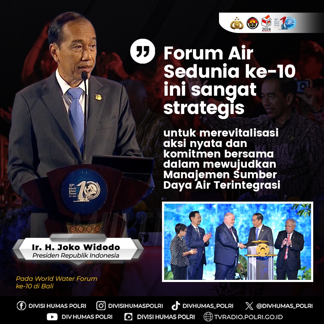 Bali – Cosmopolitanpost.com – Presiden Republik Indonesia (RI) Ir. H. Joko Widodo memimpin pertemuan World Water Forum ke-10 yang diselenggarakan di Bali pada 18-25 Mei 2024. Dalam pembukaannya, Presiden RI menekankan Indonesia mengangkat 4 inisiatif baru, yaitu: penetapan World Lake Day, pendirian Center of Excellence di Asia Pasifik, tata kelola air berkelanjutan di negara pulau kecil dan penggalangan proyek-proyek air. Komitmen Jaga Keberlangsungan #WorldWaterForum10Bali