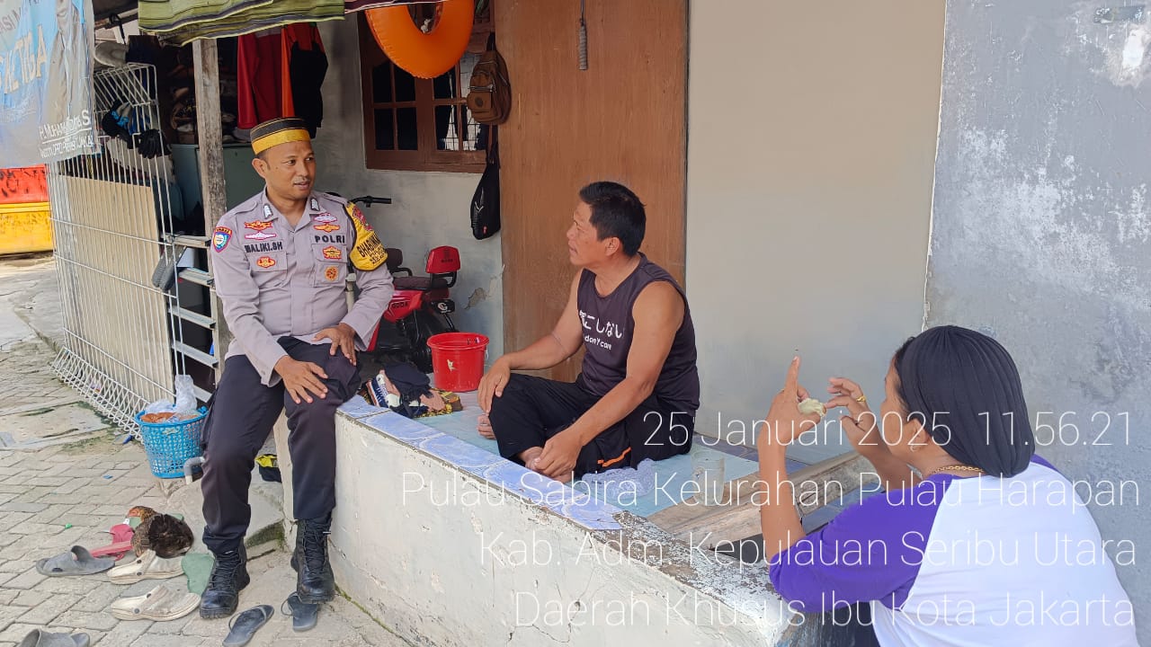 Jakarta – Cosmopolitanpost.com – Bhabinkamtibmas Pulau Sabira, Polres Kepulauan Seribu, Bripka Amirulloh Maliki melaksanakan kegiatan sambang tokoh masyarakat pada Minggu (26/01/2025). Kegiatan ini bertujuan untuk mempererat silaturahmi antara masyarakat dan pihak Kepolisian dalam upaya bersama menciptakan dan menjaga keamanan dan ketertiban masyarakat (kamtibmas).