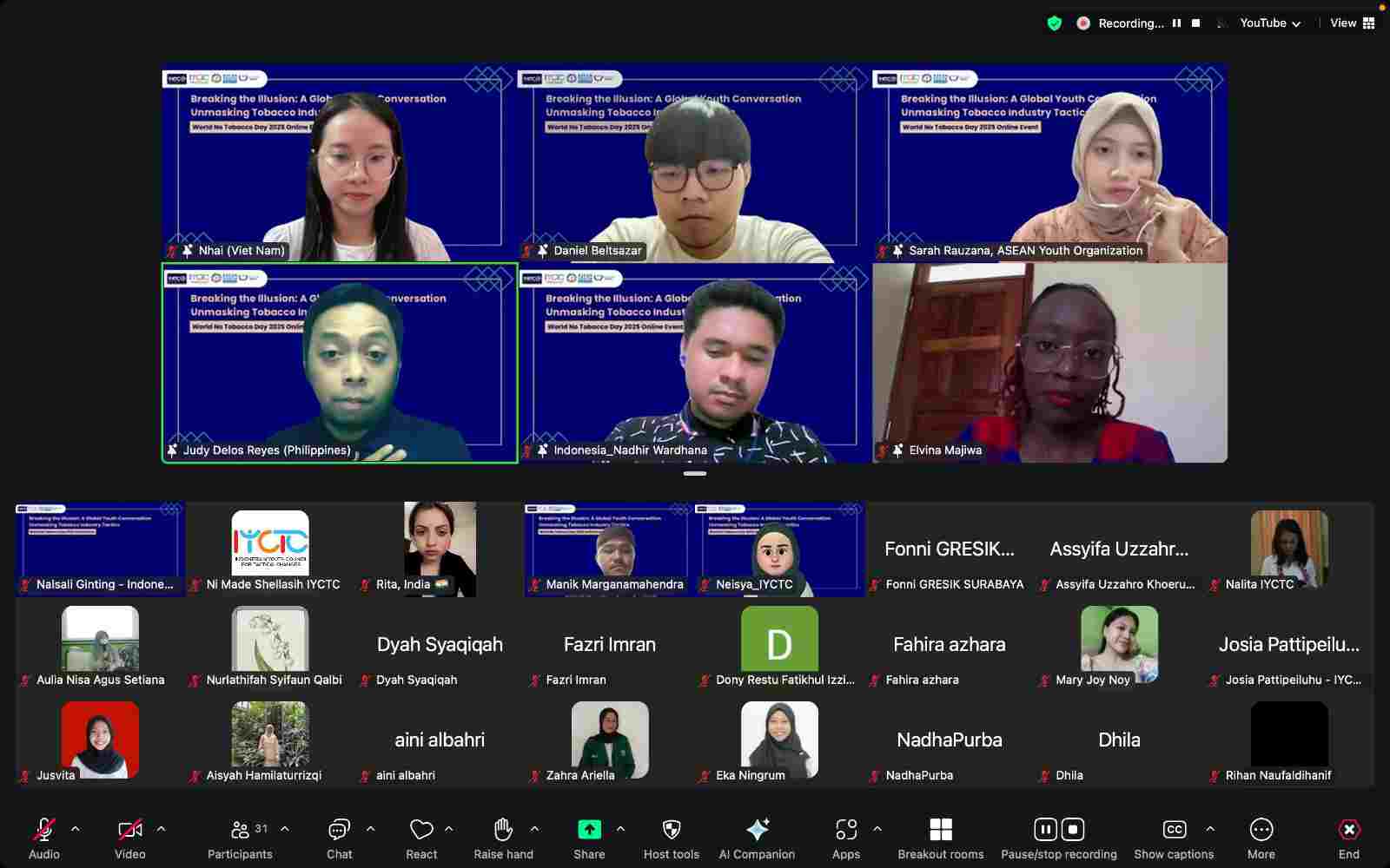 Menyambut Hari Tanpa Tembakau Sedunia 2025, sekumpulan komunitas orang muda dari berbagai negara berkumpul secara daring dalam sebuah diskusi internasional bertajuk “Breaking the Illusion: A Global Youth Conversation Unmasking Tobacco Industry Tactics”. Acara ini diinisiasi oleh Global Youth for Tobacco Control (Y4TC), berkolaborasi dengan Indonesian Youth Council for Tactical Changes (IYCTC), ASEAN Youth Organization, dan Beyond Health Indonesia.