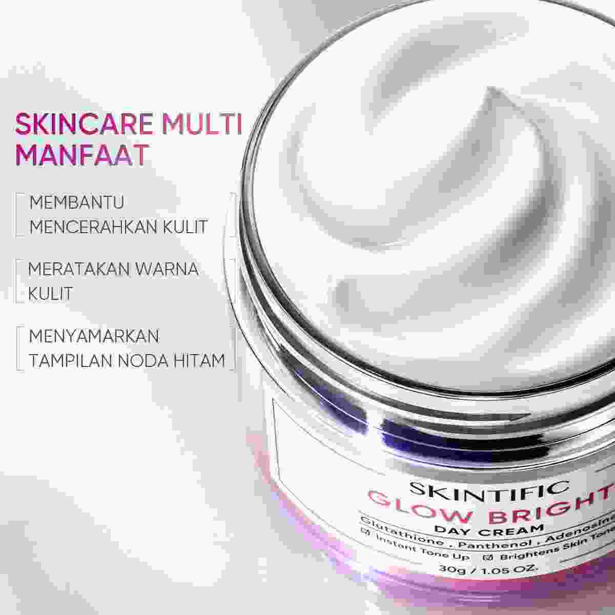 Sebagai pelopor skincare dengan formulasi berstandar ilmiah, SKINTIFIC kini hadirkan Glow Bright Day Cream sebagai terobosan baru dalam varian pelembab harian. Tidak sekedar melembabkan, day cream ini diformulasikan dengan Glutathione dan Adenosine untuk membantu mencerahkan, meratakan warna kulit, dan meningkatkan elastisitas kulit sehingga kulit tampak lebih sehat. Keunggulan utama dari produk ini terletak pada efek tone-up yang buildable yang cocok untuk semua jenis dan warna kulit, mampu disesuaikan oleh para pengguna sehingga hasil akhir cerah tanpa terlihat abu-abu, apalagi kusam.