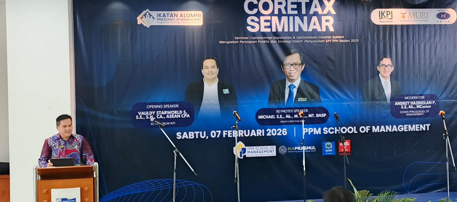 Seminar Transformasi kepatuhan dan Optimalisasi Coretax System ini sendiri merupakan persiapan praktis dan strategi efektif dalam penyusunan SPT PPH Badan. Kegiatan seminar itu digelar di Ruang A. M. Kadarman, Lantai 2, Gedung B, PPM School, Tugu Tani Menteng, Jakarta Pusat, Sabtu, 07 Februari 2026, mulai pukul 12.00 WIB.