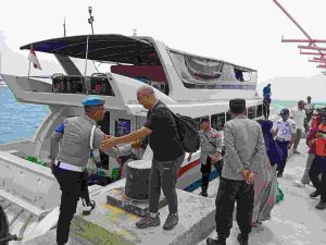 Polsek Kepulauan Seribu Utara dan Satpol PP Kelurahan Pulau Pramuka Bersatu untuk Pengamanan Kedatangan Kapal Penumpang di Dermaga Pulau Kelapa