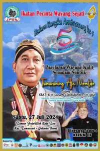 Dalang Salto Sawengi Ping Seket, Gelar Lakon ; Tumuruning Aji Norontoko di Kotu Jakarta.