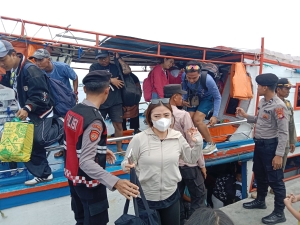 Polisi Baik Polsek Kepulauan Seribu Utara Bantu Penumpang Turun dari Kapal di Dermaga Pulau Harapan