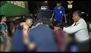 POLISI DAN WARGA GOTONG ROYONG BANTU PEMOTOR KORBAN KECELAKAAN TABRAK TRUK KORNTENER DI CILINCING