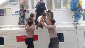Polisi Baik! Aiptu Syaihul Azhar Bantu Penumpang Turun dari Kapal dalam Pengamanan Dermaga Pulau Kelapa*