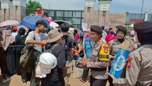 *Polwan Polda Metro Bagikan Air Mineral ke Massa Aksi di Depan DPR/MPR*