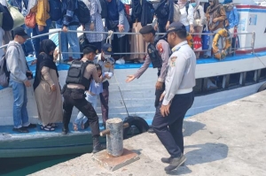 Polisi Humanis Polsek Kepulauan Seribu Utara Bantu Penumpang Turun dari Kapal dan Awasi Barang Bawaan